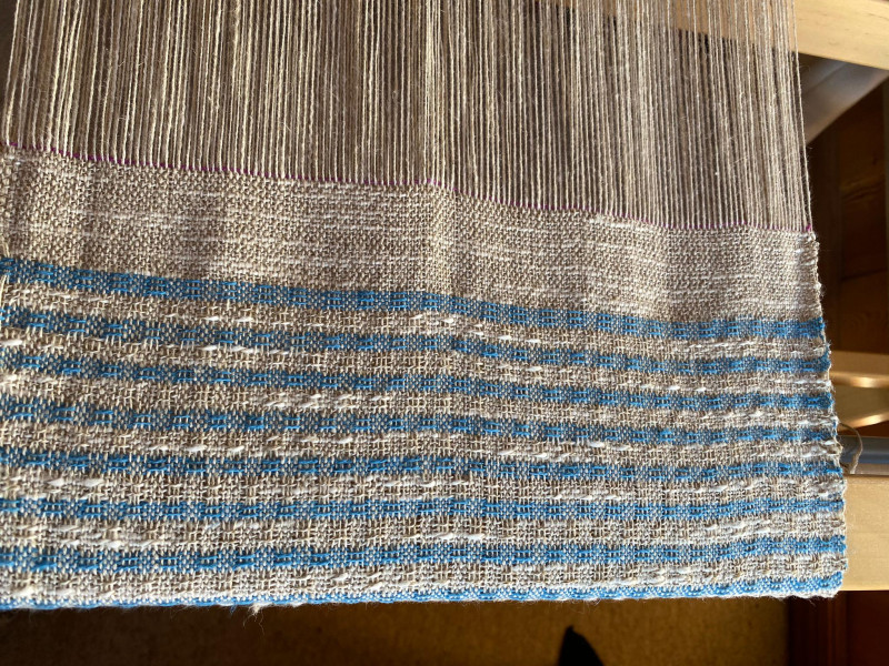 Unter Anleitung können die Teilnehmenden erste "Schüsse mit dem Schiffchen" an fertig eingerichteten Webstühlen ausprobieren und so ein Stück eigenen Stoff herstellen.