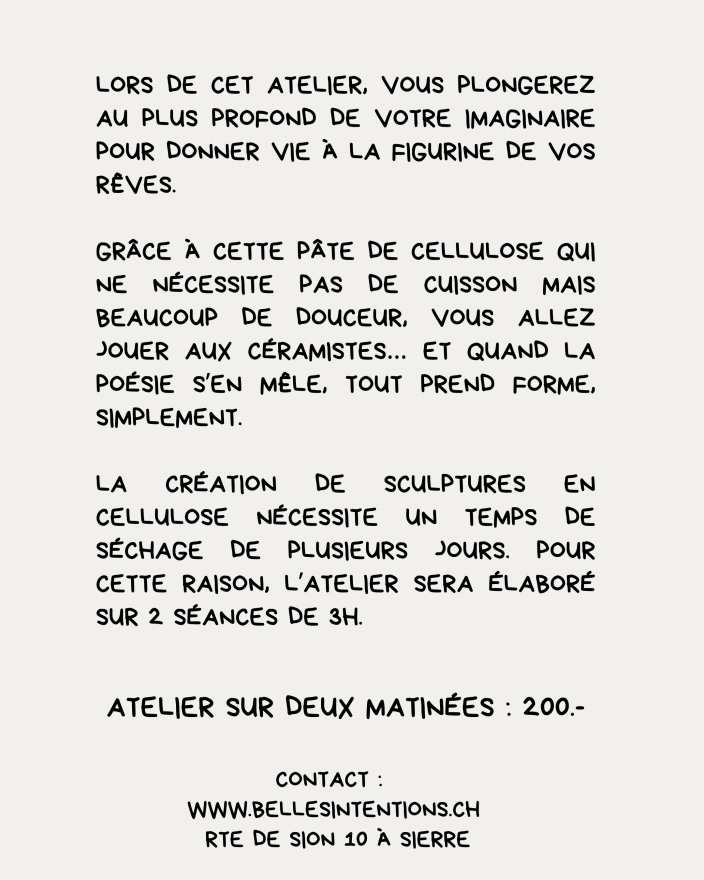 La création des figurines en cellulose nécessite un temps de séchage de plusieurs jours. Pour cette raison, l’atelier sera construit sur 2 samedis consécutifs de 3h.