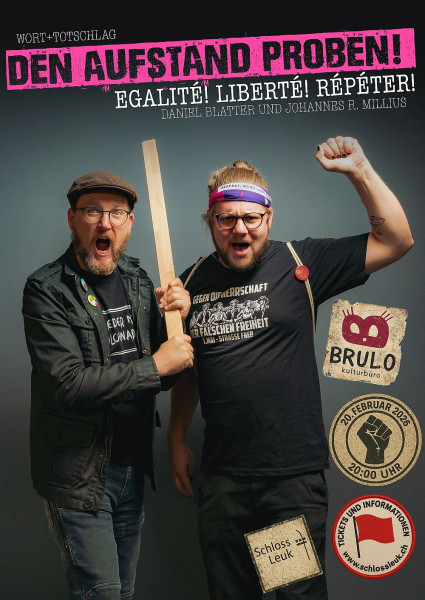 In ihrem dritten abendfüllenden Programm wagen Wort + Totschlag die Revolution! Daniel Blatter und Johannes R. Millius bewegen sich gekonnt zwischen Tiefsinn und Schwachsinn, Poesie, Spoken Word, Musik und Kabarett. Nach «Einfach mal die Messe halten!» und «Apérokalypse» folgt mit «Den Aufstand proben – Liberté! Égalité! Répétez!» ein gewohnt humorvoller Abend – ohne Samthandschuhe, mit Herz, Musik und allem dazwischen und ausserhalb. Von und mit Daniel Blatter und Johannes R. Millius.