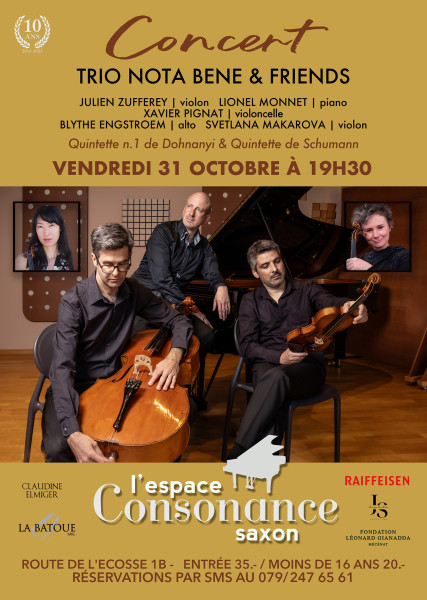 Vendredi 31 octobre à 19h30 : Concert du Trio Nota Bene & Friends avec Svetlana Makarova, violon et Blythe Engstroem, alto avec les sublimes Quintettes de Schumann et Dohnanyi à l'Espace Consonance de Saxon (Valais/Suisse).