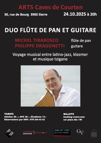 Le flûtiste de pan Michel Tirabosco et le guitariste Philippe Dragonetti nous embarquent dans un voyage musical sans frontières, où les traditions se croisent, se transforment, se réinventent. Entre Tango Nuevo, jazz latino, mélodies klezmer et fièvres tziganes, leur répertoire vibre au rythme de l’instant, laissant toute sa place à l’improvisation et à la liberté. Un concert intense, poétique et habité, qui célèbre la richesse des musiques nomades et la magie du dialogue entre deux artistes en parfaite harmonie.