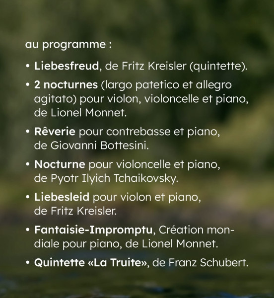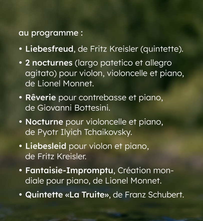 Il y aura également une création mondiale de Lionel Monnet au piano "La Fantaisie-Impromptu", ses Nocturnes pour trio (Violon-Violoncelle et piano) ainsi que du Tchaikovsky, Bottesini et Kreisler.