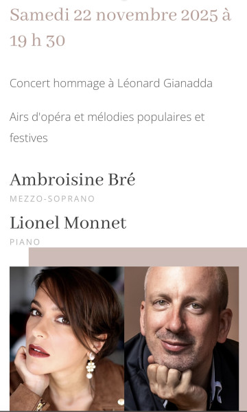 "CONCERT " HOMMAGE À LÉONARD GIANADDA" Samedi 22 novembre à 19h30 à l'Espace Consonance de Saxon : Avec AMBROISINE BRÉ, Mezzo-Soprano (Artiste lyrique internationale) et LIONEL MONNET, piano (1er Prix du Concours International de Rotterdam)