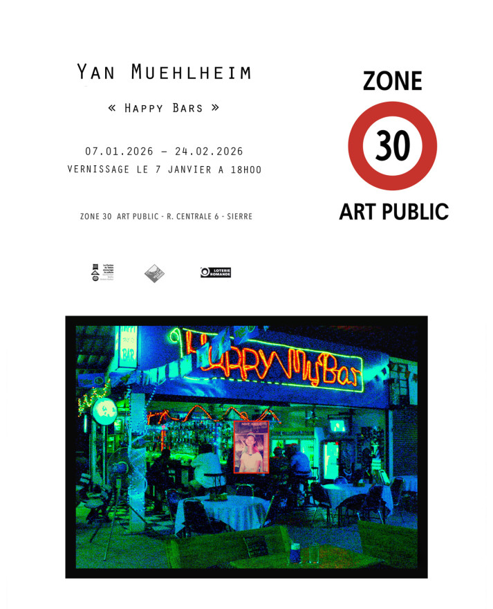 Pour ce projet imaginé spécifiquement pour Zone 30, l’artiste valaisan replonge dans les archives de son périple de deux mois en Thaïlande, il y a presque vingt ans, avant l’avènement des réseaux sociaux et la saturation numérique globale actuelle. Loin d’une approche documentaire, Yan Muehlheim manipule et retravaille ses photographies prises sur le vif, de nuit, sans flash, proposant des vues a priori typiques de ces bars, cafés et restaurants ouverts sur la rue. Jouant avec les couleurs, l’exposition, le bruit, les contrastes et les saturations et troublant la vision du spectateur ou de la spectatrice, il reconstruit un univers visuel évoquant la culture nocturne, la fête et les boîtes de nuit, dans des lieux qui ne sont pas forcément destinés à cette fonction. Si la majorité des client·e·s présent·e·s sont des hommes occidentaux, des indices précis sur la localisation de ces prises de vues émergent à travers le cadre général des clichés, les décorations et enseignes de certains établissements, le goût pour les néons ou encore la présence systématique d’un écran dans chaque lieu, diffusant notamment des blockbusters américains.