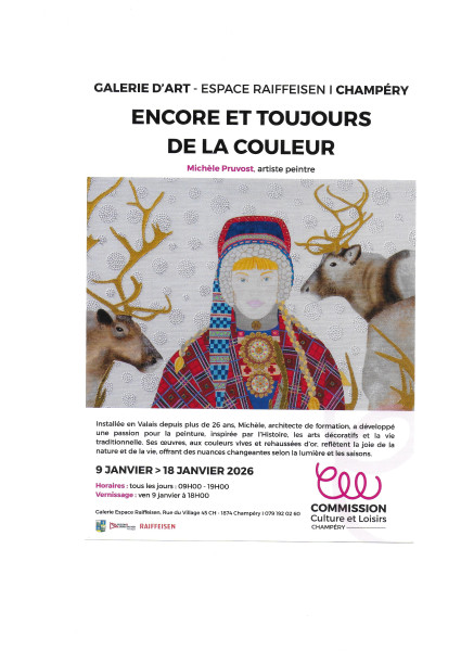 Installée en Valais depuis plus de 26 ans, Michèle, architecte de formation, a développé une passion pour la peinture, inspirée par l'Histoire, les arts décoratifs et la vie traditionnelle. Ses œuvres, aux couleurs vives et rehaussées d'or, reflètent la joie de la nature et de la vie, offrant des nuances changeantes selon la lumière et les saisons.