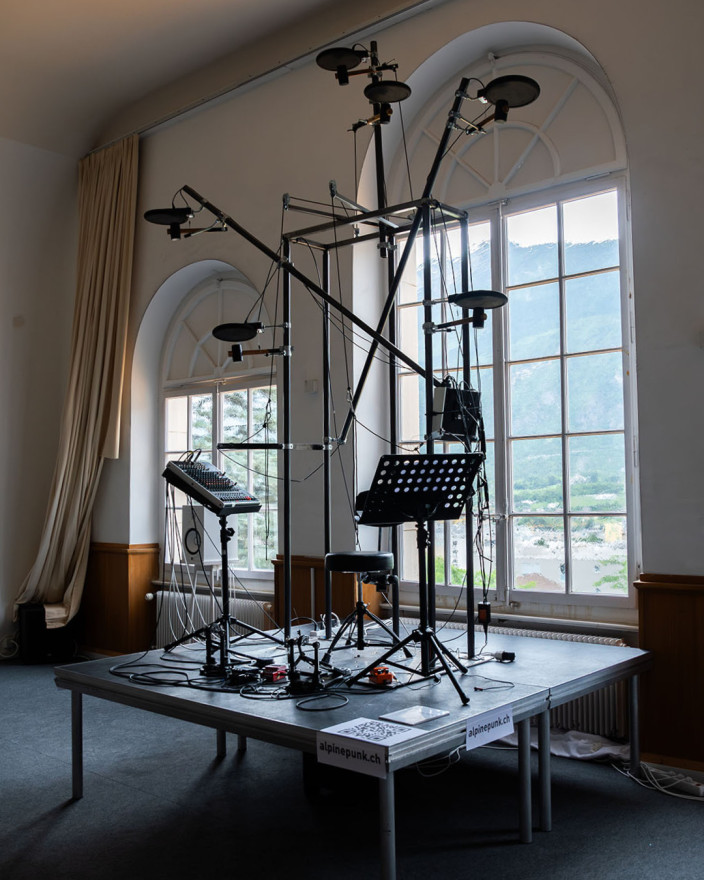 « Carillon Sauvage » est une performance sonore utilisant une machine sculpturale qui reproduit le jeu traditionnel des carillonneurs valaisans. L’instrument simule de manière fidèle le carillon du clocher de Martigny. Cet instrument unique est utile pour une pratique hors du clocher et permet une exploration et une transformation du son en direct. La performance s’ajoute au développement du nouveau cadre narratif Alpine Punk, un sous-genre de science-fiction mettant en lumière les préoccupations sociales, environnementales et spirituelles des habitants et habitantes du massif alpin.