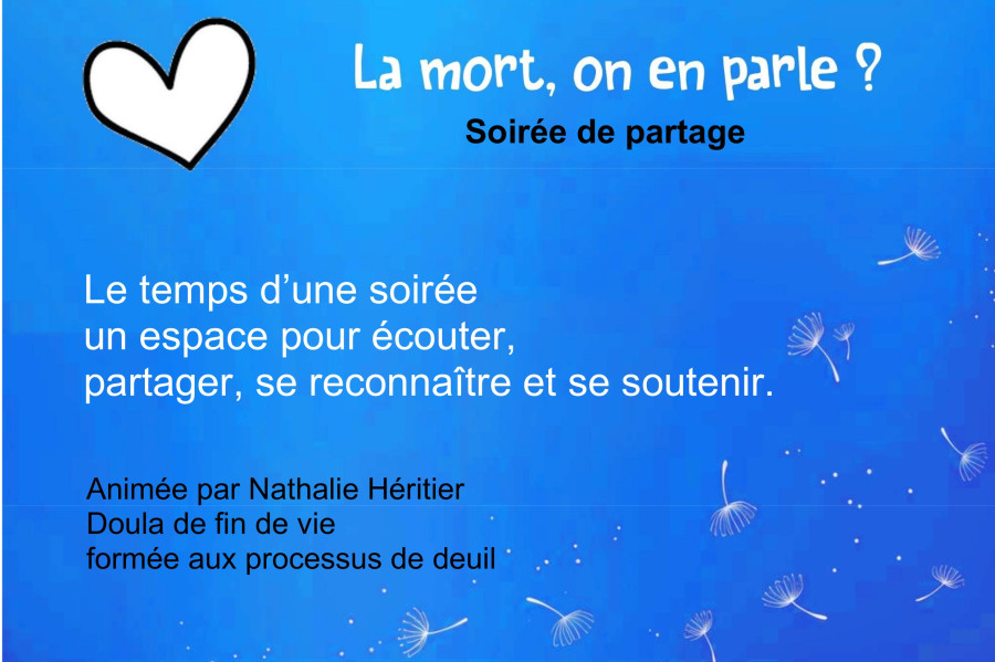 La soirée de partage est animée par Nathalie Héritier, Doula de fin de vie et formée aux processus de deuil. Le temps d’une soirée, nous vous offrons un espace pour écouter, partager, se reconnaître et se soutenir. La mort traverse nos vies, bouscule nos repères, fissure nos certitudes et génère un flot d’émotions qu’on peine à accueillir. Pour toutes celles et ceux qui ont un deuil dans le cœur, récent ou ancien, discret ou déchirant, la porte est ouverte.