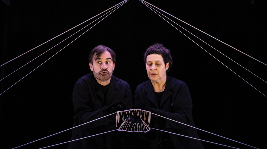 Avec comme seul accessoire le fil élastique traversant l’espace scénique d’un bout à l’autre, Fatna Djahra et Christophe Noël créent des images aussi poétiques qu’éphémères, en s’inspirant des jeux de ficelle des cours d’école d’antan. Se crée ainsi une cartographie tendre et joyeuse, telle une toile délicate et malléable tendue entre passé et avenir.