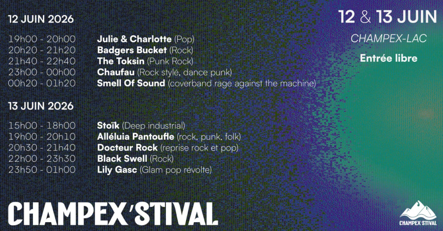 Le Champex’stival vous donne rendez-vous les 12 & 13 juin 2026 à Champex-Lac pour deux jours de Rock, de Funk et de Pop en concerts live pour le plein d’émotions en plein air, au cœur des Alpes.