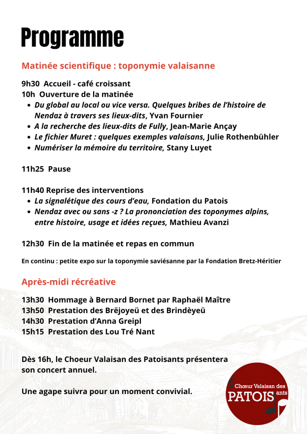 Afin de faciliter l'organisation, une inscription par mail (contact@patois.ch) est souhaitée.