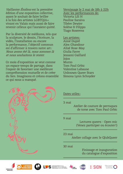 Vaillantes Étoilexs ist die erste Ausgabe einer Kollektivausstellung mit dem Wunsch, sowohl LGBTQIA+-Künstler·innen, die im Wallis leben, sichtbar zu machen, als auch jene zurückzubringen, die die Region verlassen haben.
