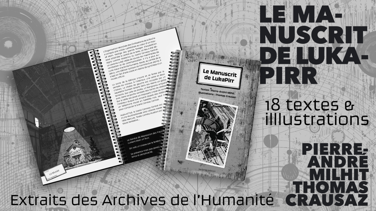 Le Manuscrit de Lukapirr. Illustrations de Thomas Crausaz et textes de Pierre-André Milhit. 18 illustrations et textes. 44 pages, format A5. Reliure spirales métalliques. Signé par les auteurs. https://tharmine.com/boutique