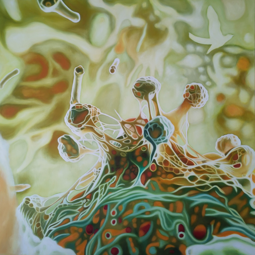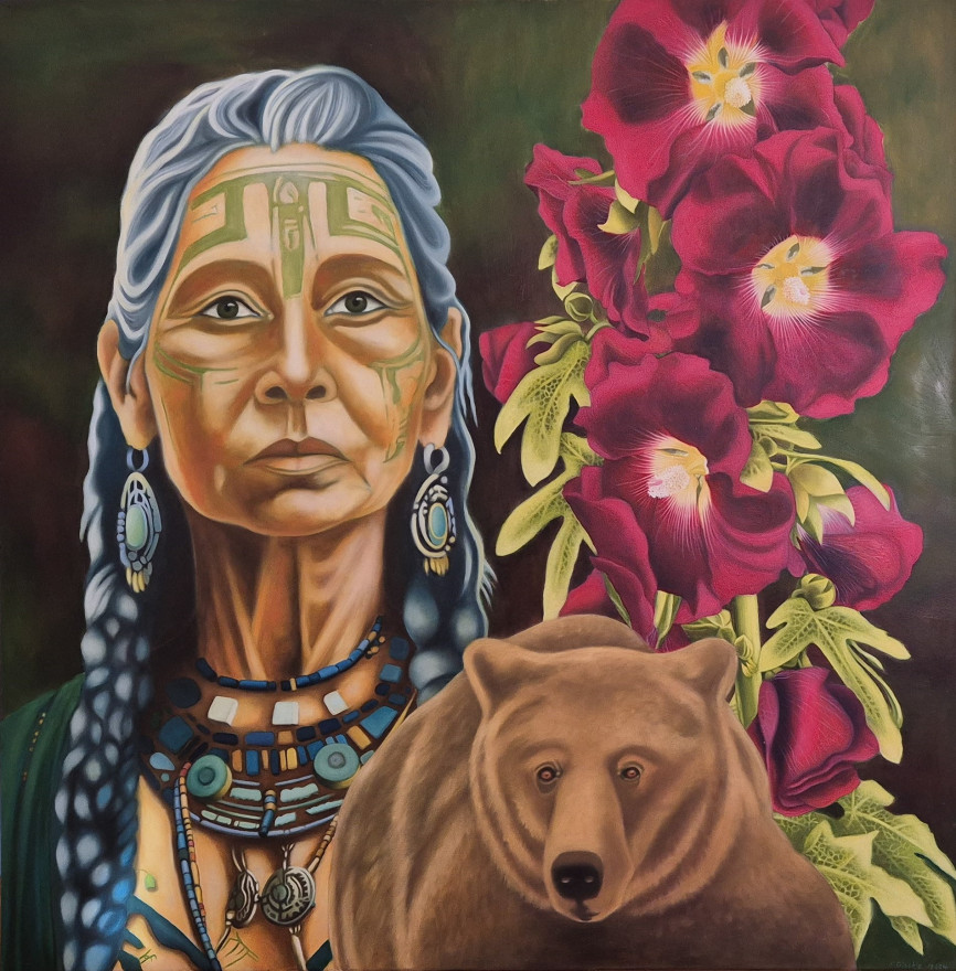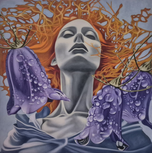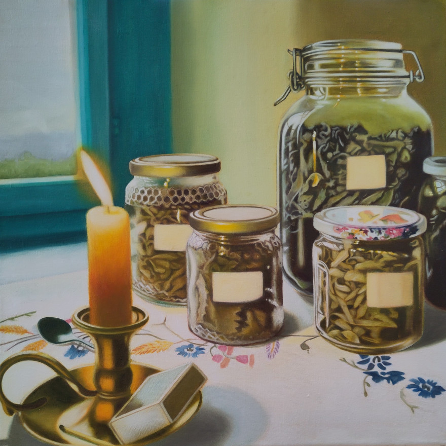 „MONDES DE FLEURES (MYSTERIEUX)“ – Schimmernde Gartenblumen, die kostbare lichterfüllte Arrangements mit Gläsern, Flaschen oder Vasen einhergehen, dazu als Kontrast typische Pflanzen der Bergwelt in extremer Vergrösserung verführen unsere Augen tief einzutauchen. Wir erliegen der Faszination von Esther Gischigs weichem, samtig-sanften Farbauftrag, der Schicht um Schicht oszillierende, changierende Flächen und magisch leuchtende Blumen wie Pflanzen entstehen lässt… und staunen, als ob wir die Welt mit ihren Geheimnissen und Schönheiten zum ersten Male sehen würden. (Dr. Martina Kral, Kunsthistorikerin)
