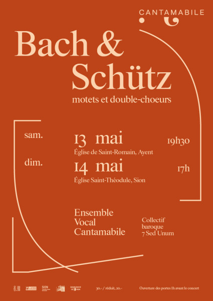 L’Ensemble Vocal mixte Cantamabile, sous la direction de Marie-Marthe Claivaz, proposera au public valaisan deux concerts de musique sacrée baroque intitulés « Bach & Schütz : motets et doubles-chœurs ». A cette occasion, trois des Grands Motets de Jean-Sébastien Bach, ainsi que six motets de Heinrich Schütz seront interprétés. L’ensemble sera accompagné par le Collectif baroque 7 Sed Unum.