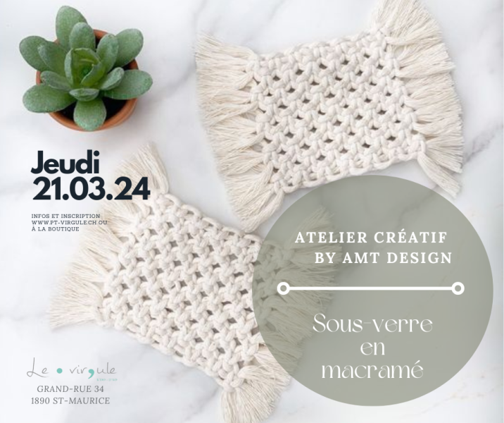 Les ateliers créatifs by AMT Design vous proposent, le jeudi 21 mars 2024, de confectionner votre propre sous-verre en macramé.