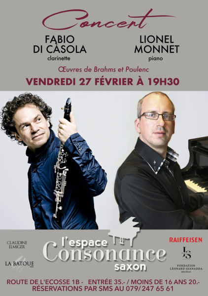 Concert de Fabio Di Càsola, clarinette et de Lionel Monnet, piano - Vendredi 27 février à 19h30 à l’Espace Consonance de Saxon
