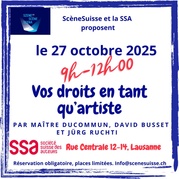 Vous avez toujours eu des questions sur vos contrats ou sur vos droits en tant qu’artistes ? Une conférence interactive aura lieu le 27 octobre entre 9h et 12h à la SSA Lausanne. Inscriptions à l'adresse mail . Plus d'infos ci-dessous
